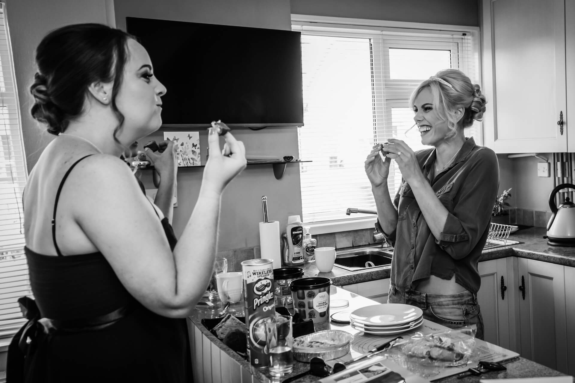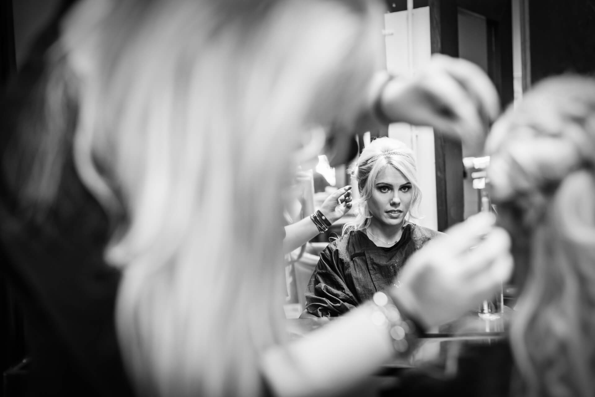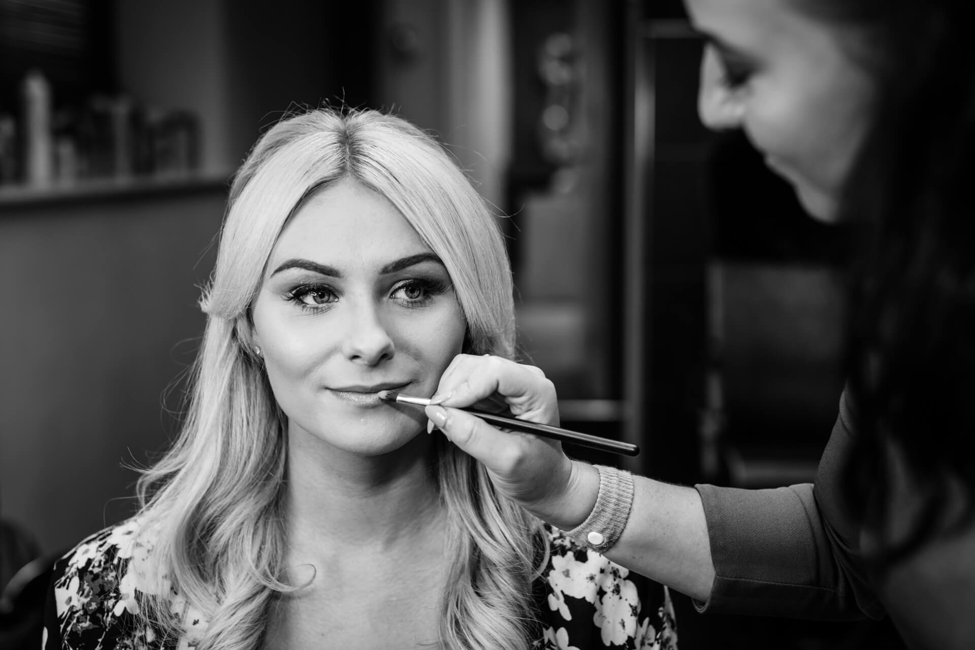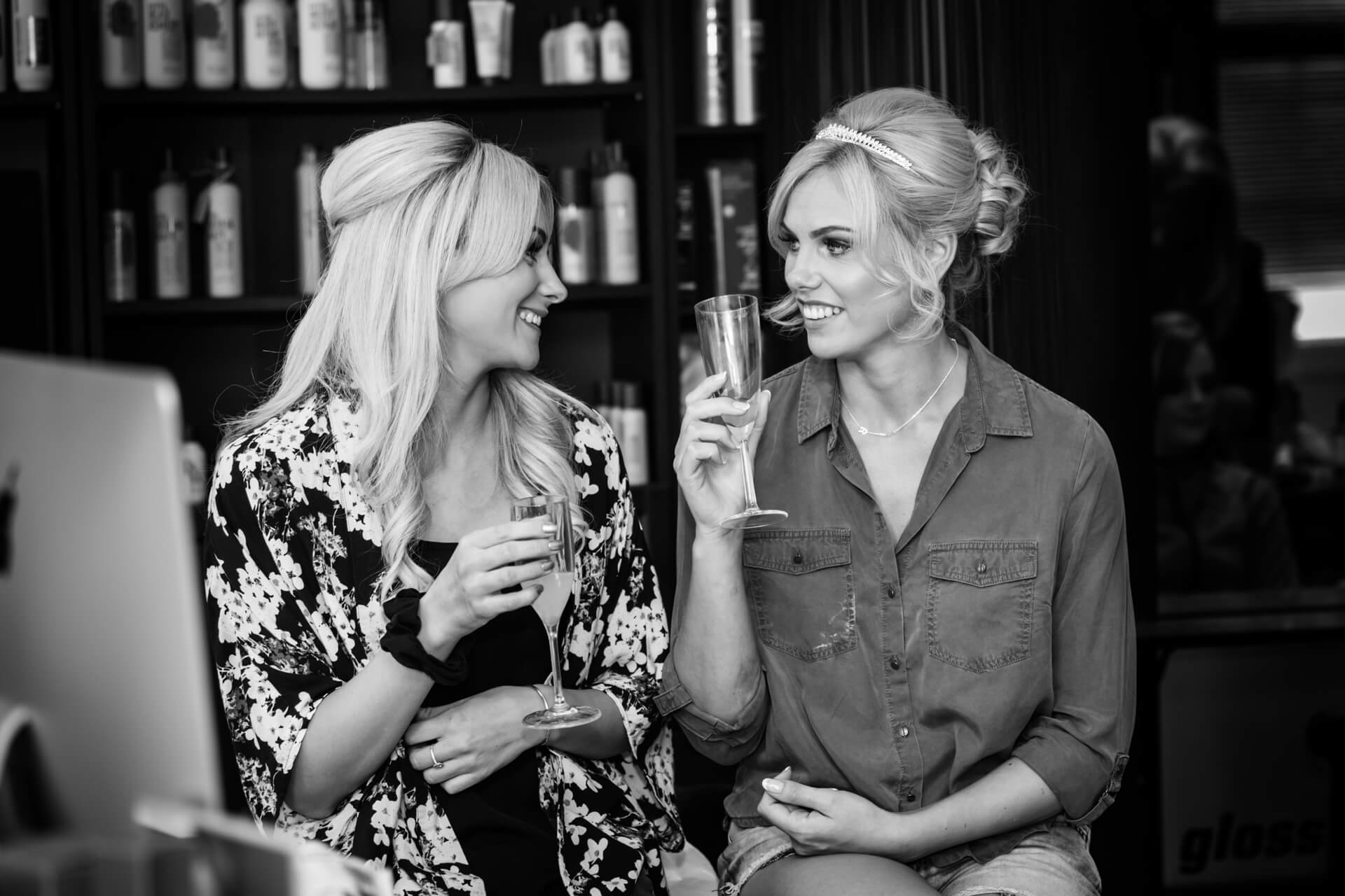 We had a fabulous sunny day for some Wood Hall Hotel wedding photography with super fun and relaxed couple Becky and Grant. The day started with a trip to Gloss Hairdressing in Knaresborough where all the girls were excitedly getting ready and sipping champagne. This is a lovely big salon and a great place to photograph the preparations. Whilst there I heard the ongoing story about the big wind up with Grant, the groom.
