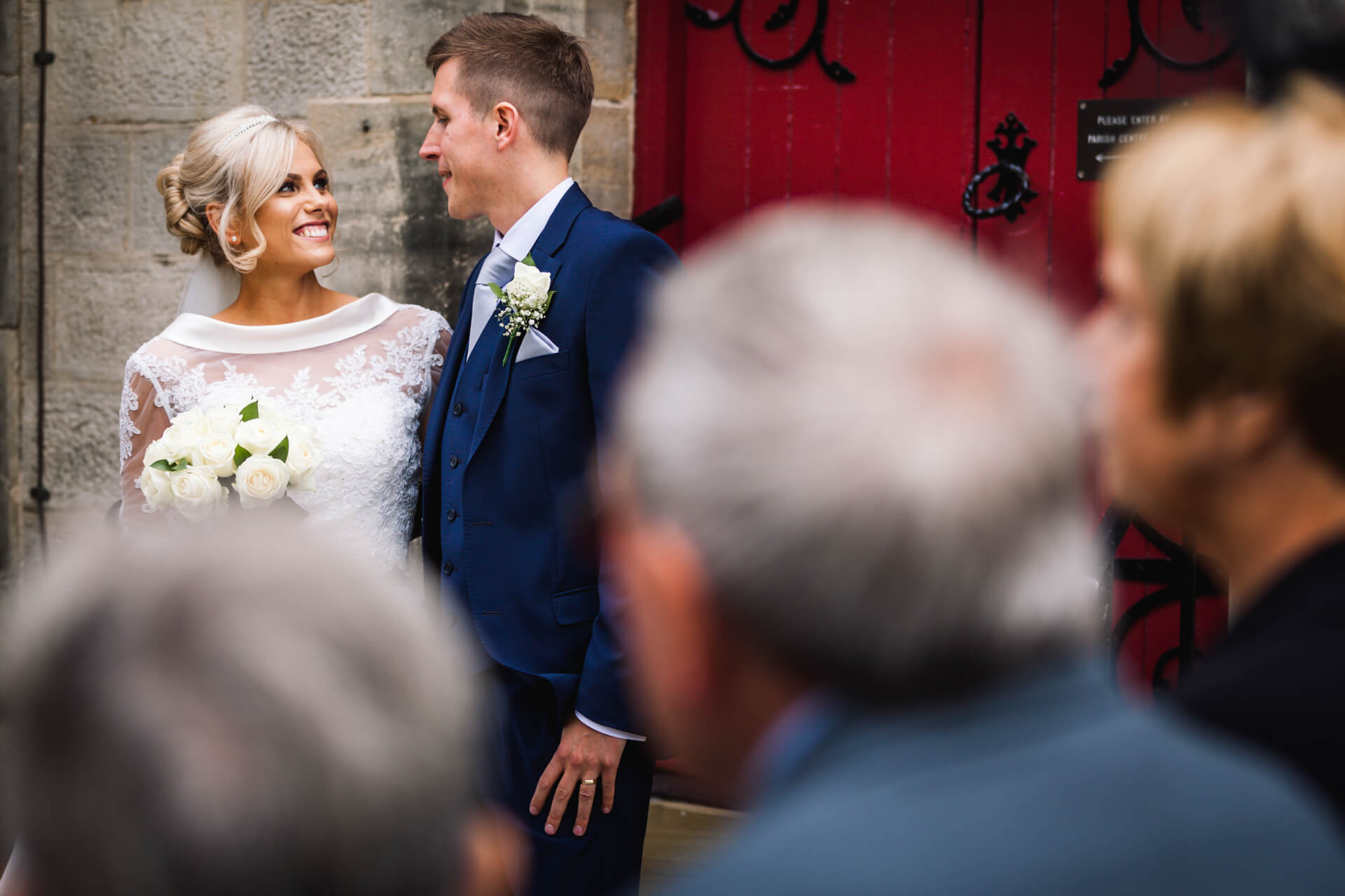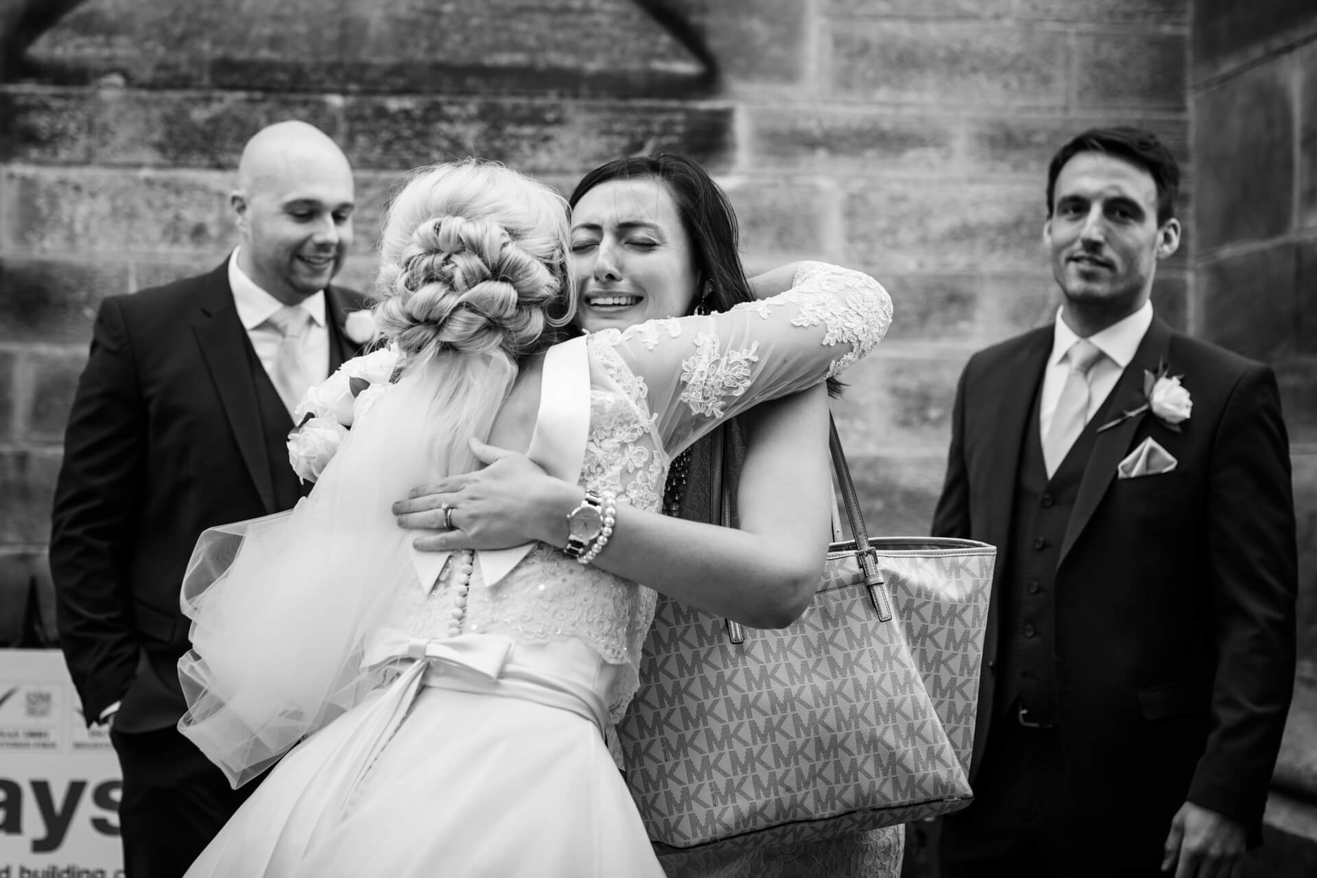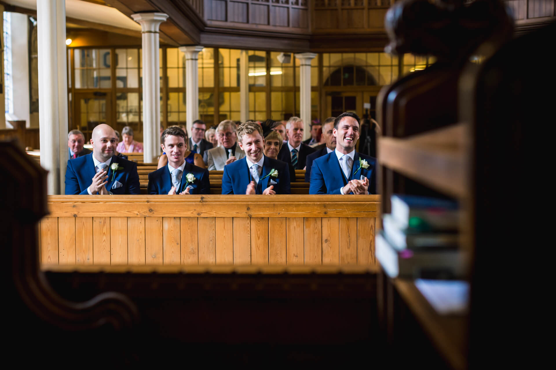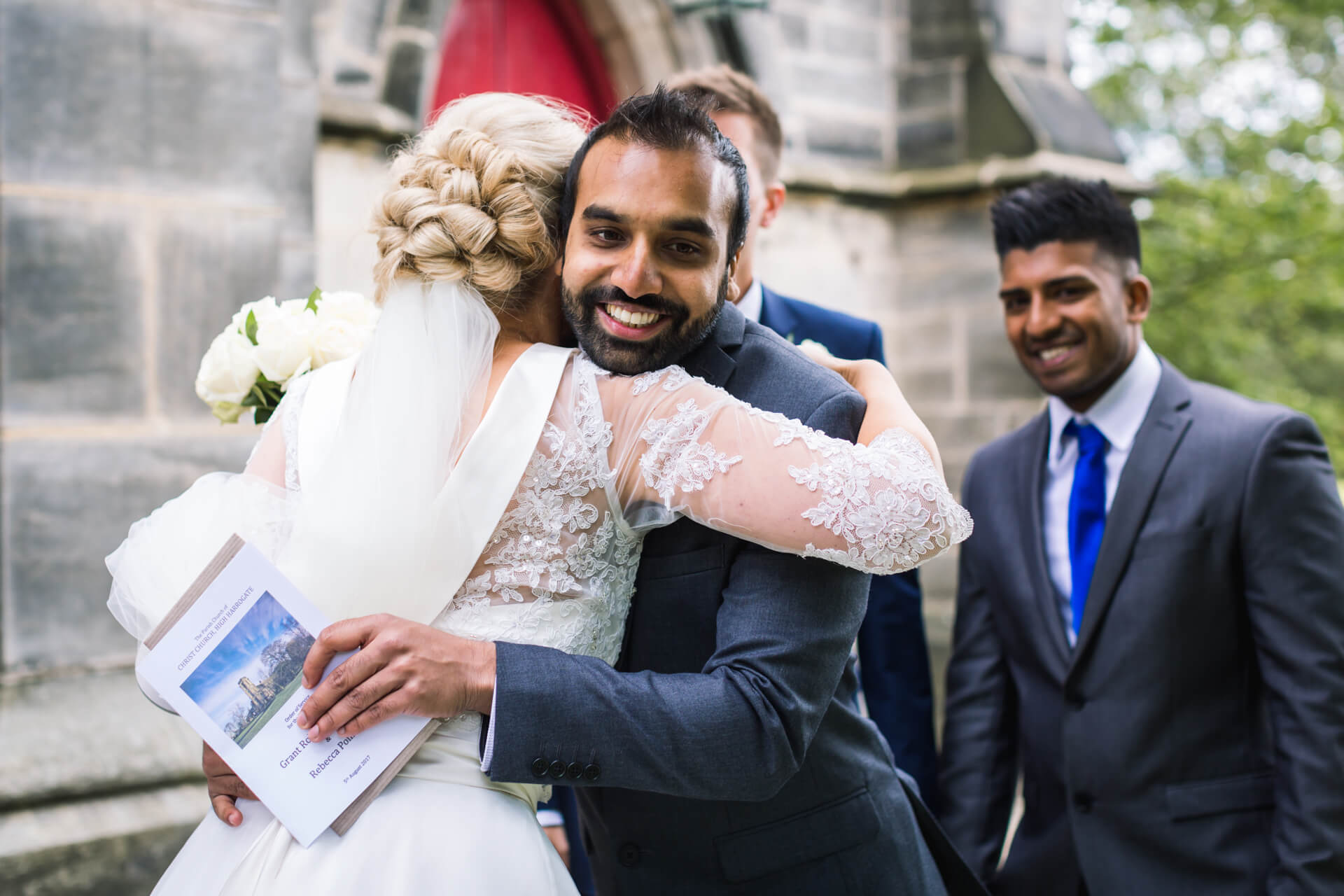 Once hair and makeup was done we were back to Becky’s parents house in Harrogate to get into those fabulous dresses. The bridesmaids looked gorgeous in navy blue and Becky looked absolutely stunning in her Art Couture dress from Treasured Brides, and not a hint of pink in sight! Meanwhile, Grant and his groomsmen were on route to the church in Harrogate to await the bridal party and have a couple of pints at the local pub.