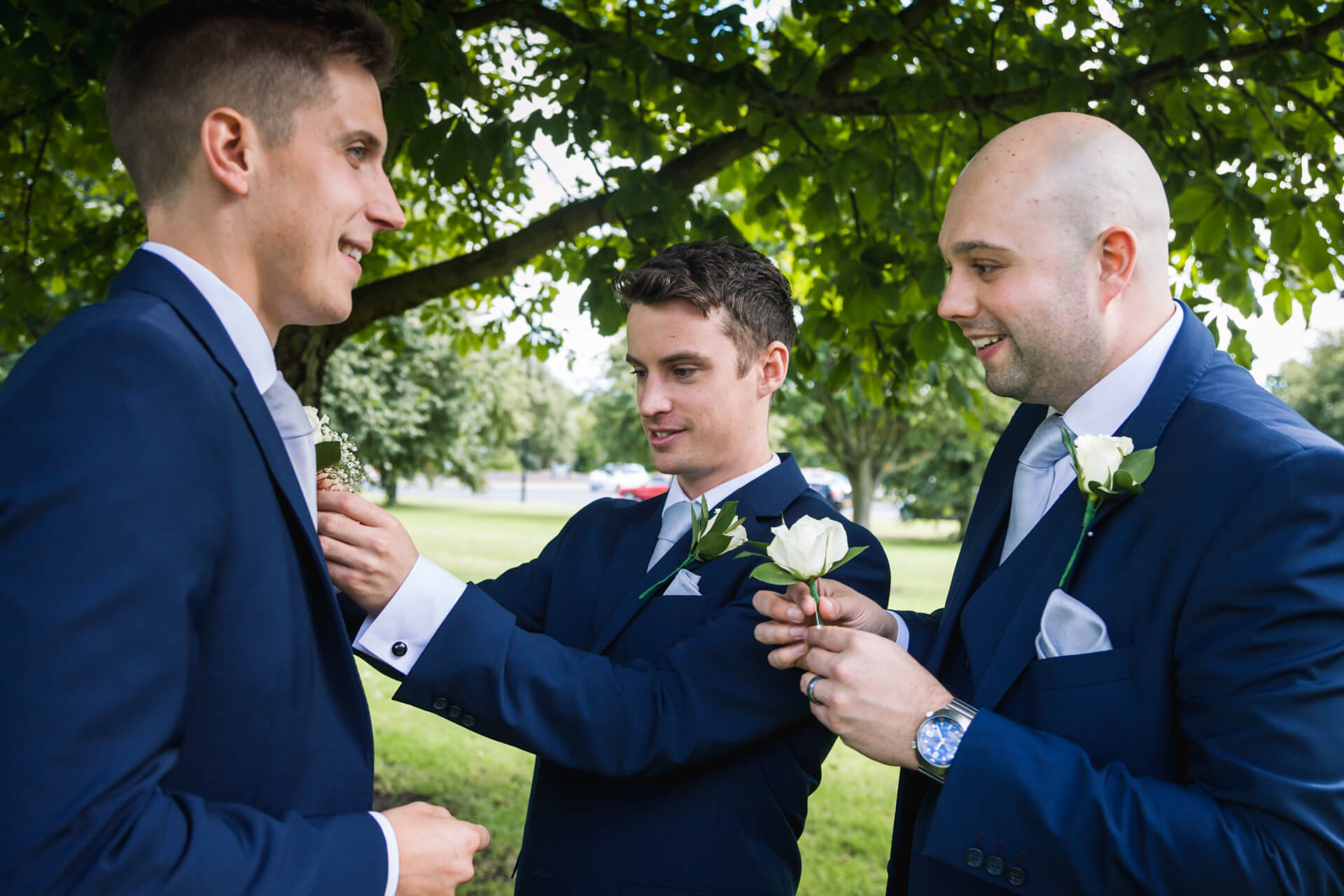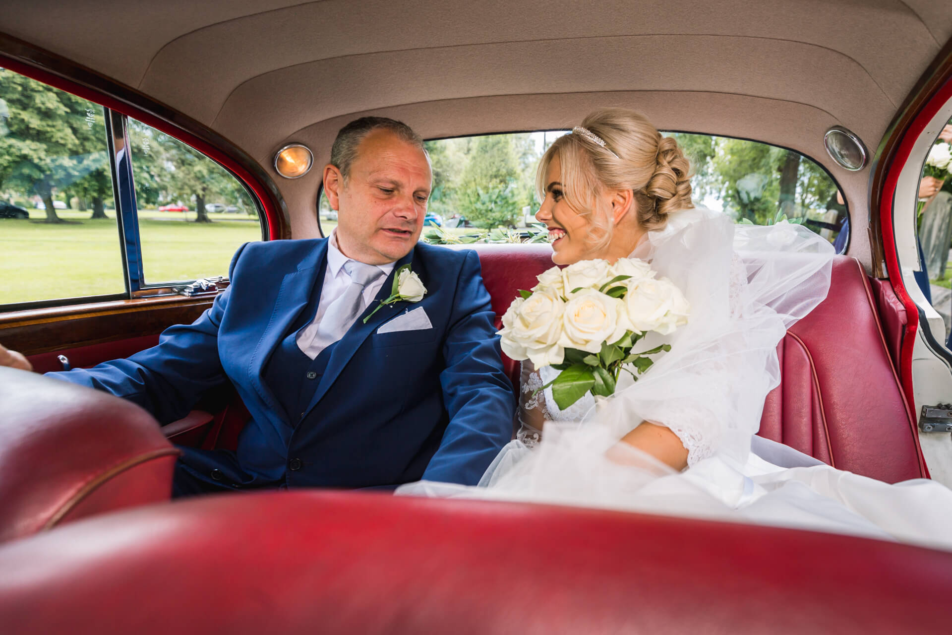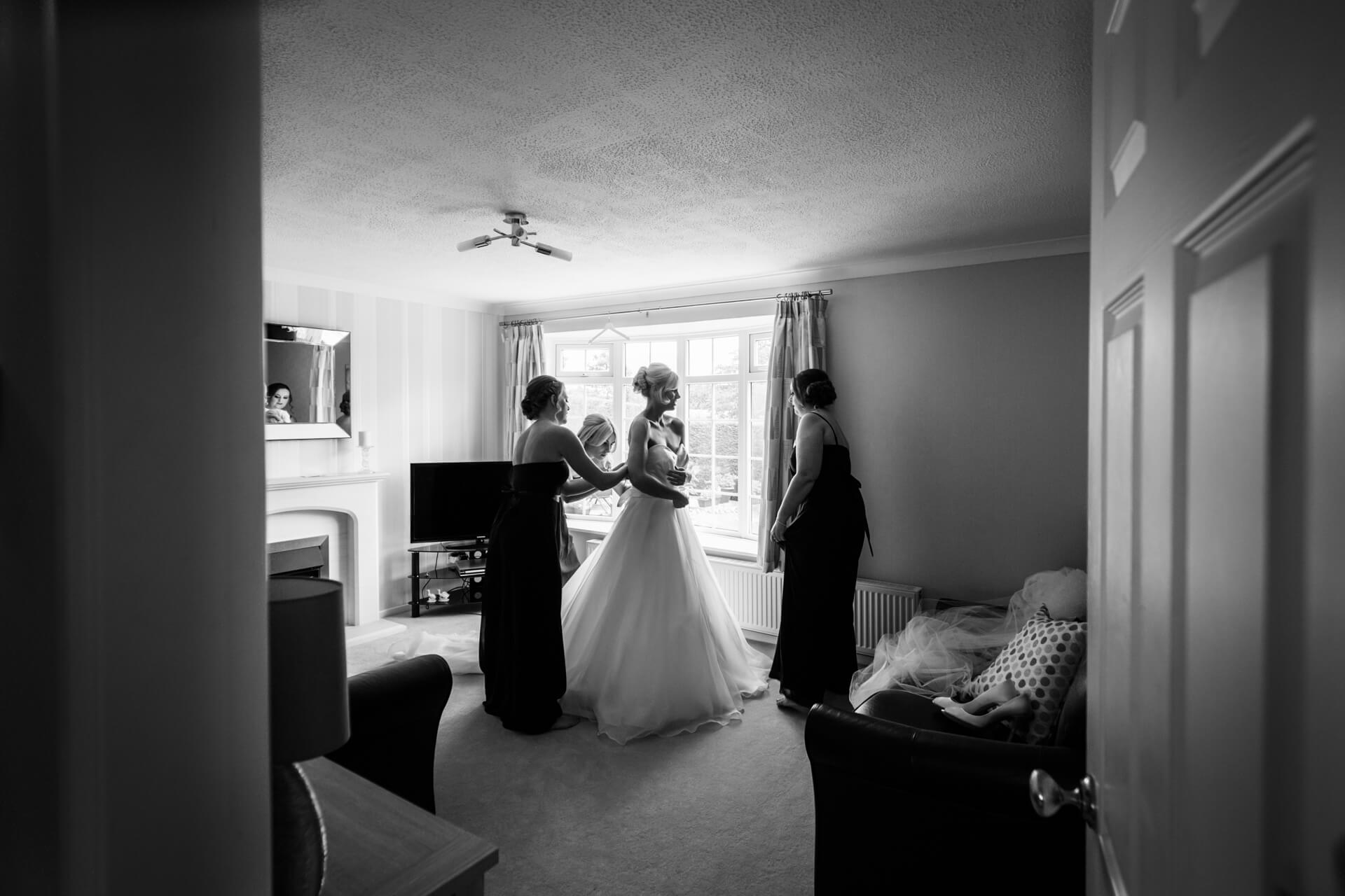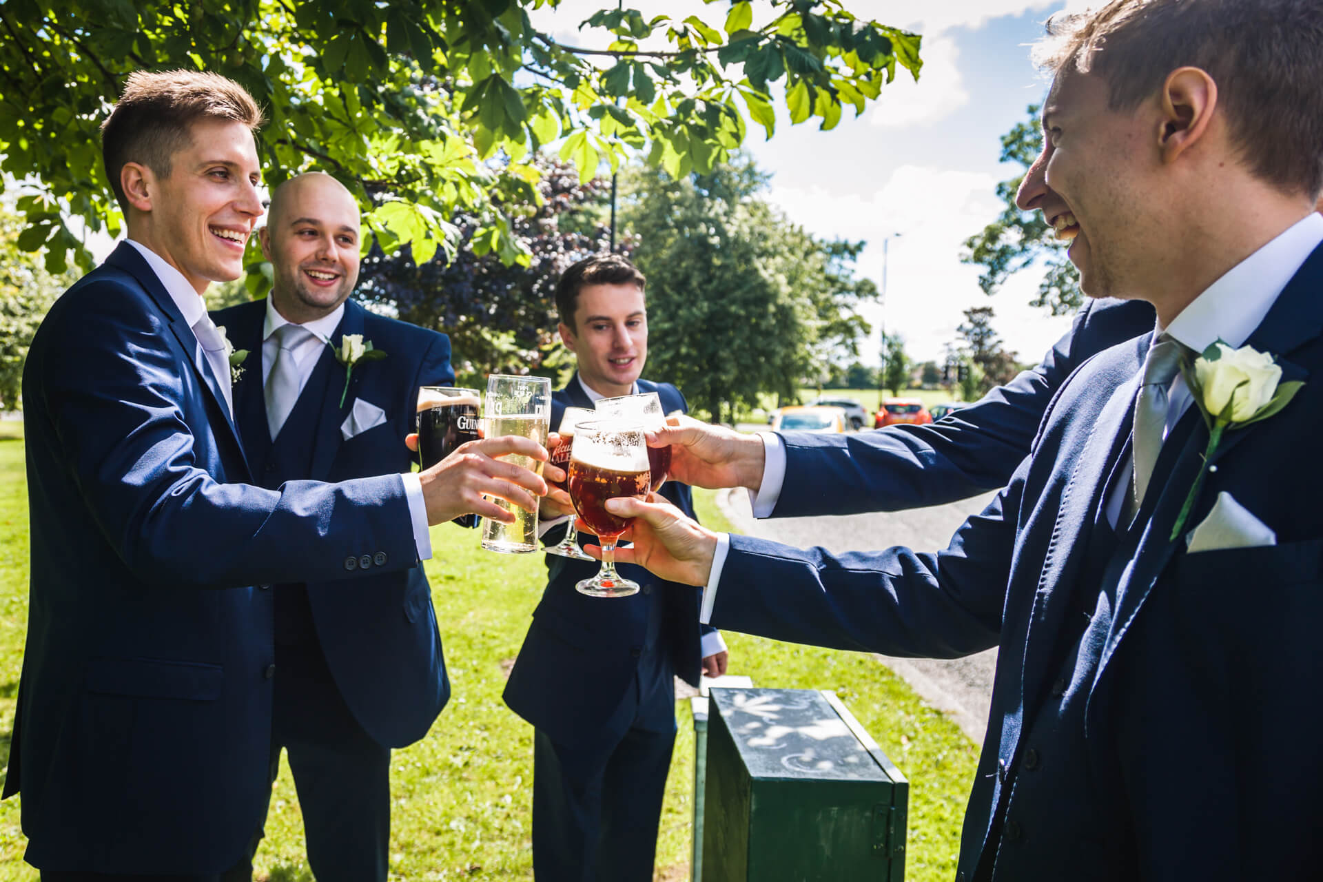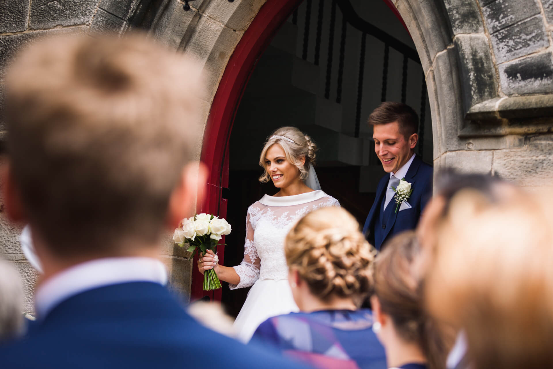 Once hair and makeup was done we were back to Becky’s parents house in Harrogate to get into those fabulous dresses. The bridesmaids looked gorgeous in navy blue and Becky looked absolutely stunning in her Art Couture dress from Treasured Brides, and not a hint of pink in sight! Meanwhile, Grant and his groomsmen were on route to the church in Harrogate to await the bridal party and have a couple of pints at the local pub.