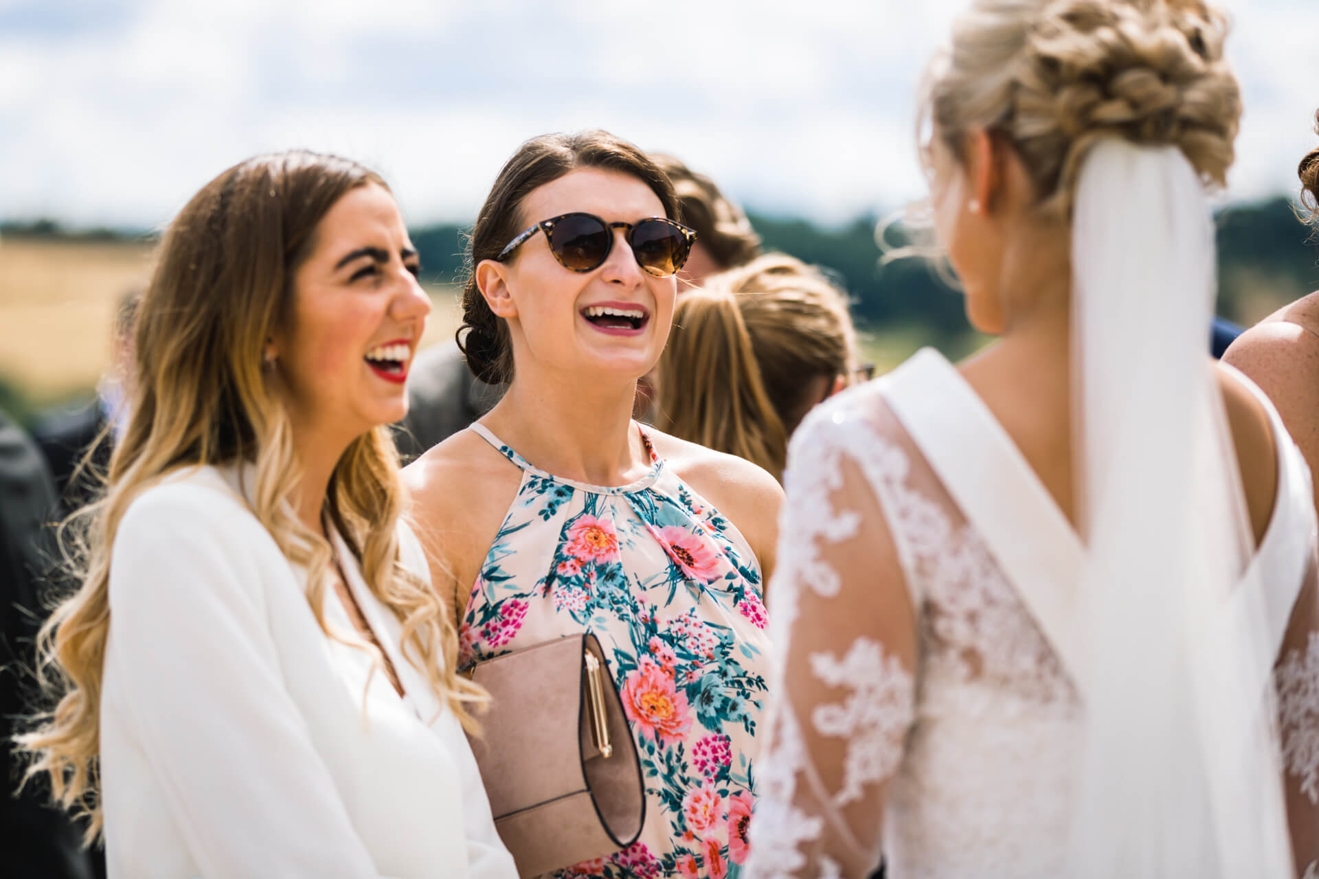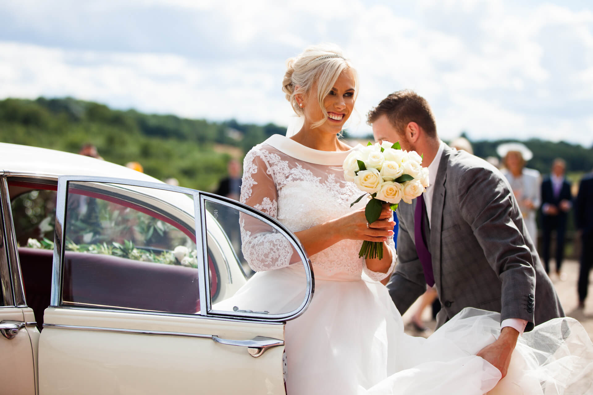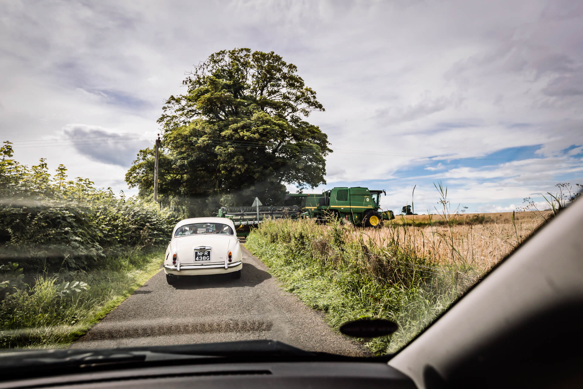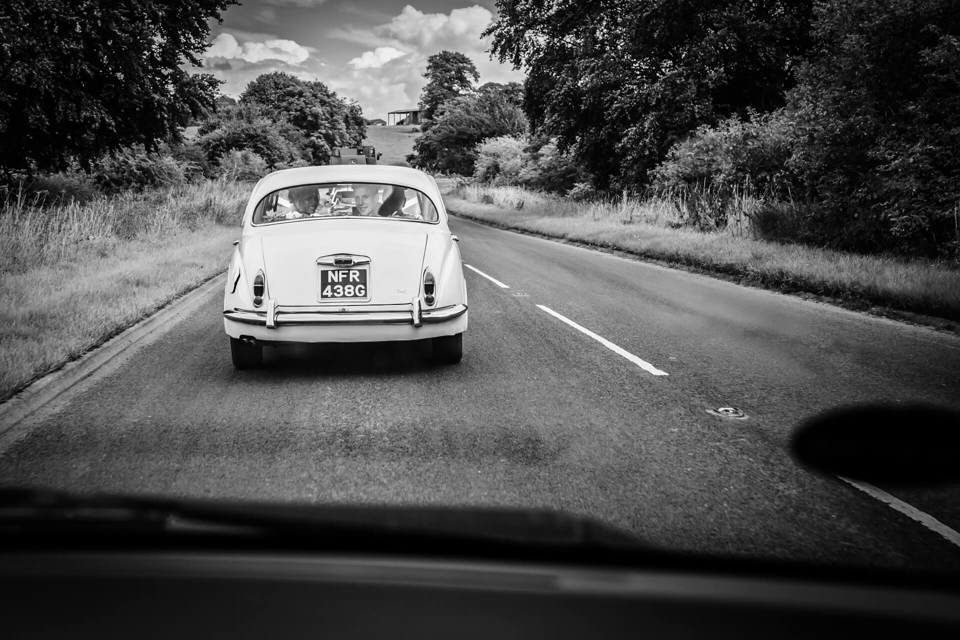 Becky and her Dad travelled to the church in style in a white Jaguar Mk 2 which had come all the way down from Durham. The ceremony went without a hitch and the couple walked out to much applause followed by a shower of confetti. On route to the Wood Hall Hotel I followed behind the Jaguar in my humble Honda. What we didn’t realise was how long it was going to take us! We got stuck behind a giant combine harvester, I mean this green monster completely filled the road and moved at a snails pace! At first I though it will just turn off soon, but at every turn we were still following it. In fact we followed it all the way to Wood Hall where it finally turned off about 100 yards from the venue with a huge convoy of wedding cars left behind it! Everyone took it in their stride though and we still had plenty of time to stop at the top of the Wood Hall lane to get some couple shots. Wood Hall Hotel is a fabulous Yorkshire wedding venue set in some gorgeous landscape.